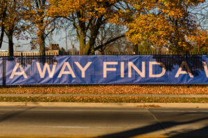 Syms created four new works for the new collaboration between Bronzeville Center for the Arts and Sculpture Milwaukee. This presentation—Find A Way, A Short Meditation, Belief Strategy XIII, and an untitled photograph—includes photography, mantra, and visual patterns, offering a meditative prompt for viewers moving through the day-to-day.